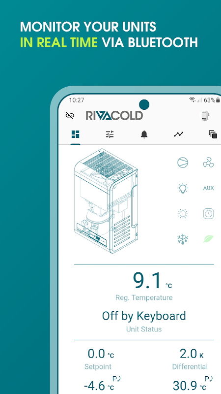 तेज़ ब्लूटूथ कनेक्शन के साथ, यह उपयोगकर्ताओं को RIV-EVO इलेक्ट्रॉनिक बोर्ड से लैस समर्थित उपकरणों, जैसे कि BEST पैकेज्ड सिस्टम और UNICA कंडेंसिंग यूनिट, तक पहुँचने और कॉन्फ़िगर करने की सुविधा देता है।