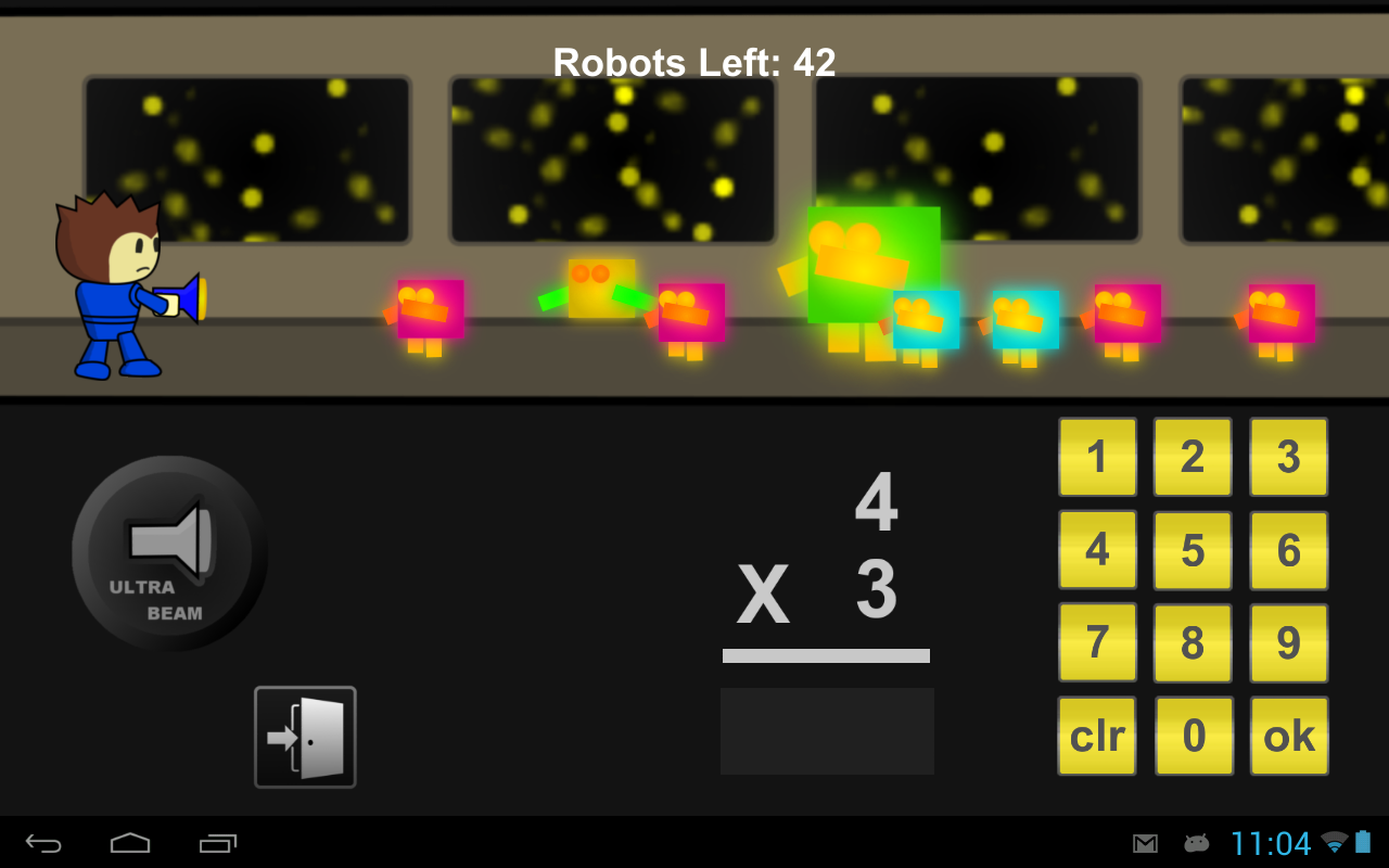 Defend your space colony from being invaded by an army of robots! As a space cadet, you are armed with the robots' only weakness - math powered ray beams! To use your ray beam, simply answer a math problem. If you are correct, it will send a beam of light flying towards the nearest robot to fry their electronics! Each correct answer in a row will add a charge to your ray beam. Once your ray beam is fully charged, its most powerful attack will activate - the ultra beam! Using the ultra beam will fry every robot in the area at just the push of a button. However, any incorrect answer you make will reset the charge back to zero!