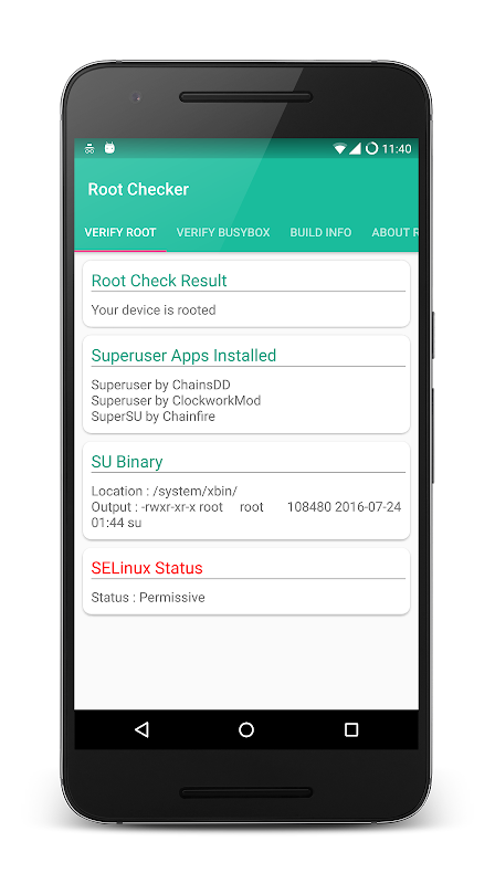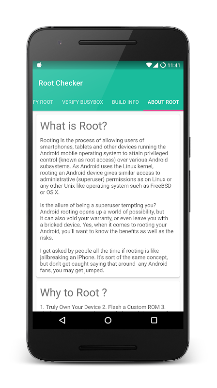 This Root Checker provides a very simple way to check root on your device without messing up anything. It gives every info that one might need from a newbie user to an advanced user as well.