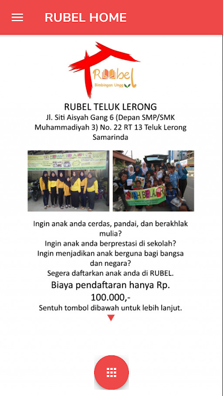 Aplikasi Rubel (Rumah Belajar) Teluk Lerong Samarinda yang memuat informasi mengenai tempat bimbel (bimbingan belajar) Rubel.