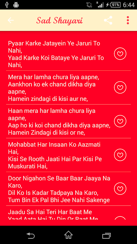 Enjoy the largest collection of Sad Shayari (Hindi Messages) to share with your loved ones ,friends and family by whatsapp , facebook, SMS, email, Chats, etc. Click on the shayari and choose the app from the dialog through which you want to send the message. Shayari lets you explain sentiments in all their forms through rhythmic words. ☆Sad Shayari ☆ Collection in Hindi and based on every emotion and theme. Shayari is unique poetic way to express yourself and express your feelings deep in heart. This app is the right place for Specially Sad Shayari on every Best in class categories like Dard bhari shayari and break up Shayari.