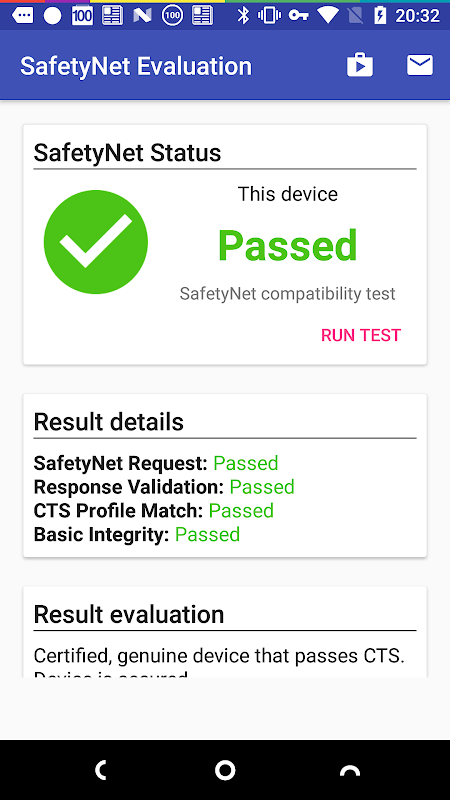 SafetyNet Evaluatuion SafetyNet संगतता परीक्षण के साथ डिवाइस सुरक्षा पुष्टि करता है और परिणाम का मूल्यांकन।
