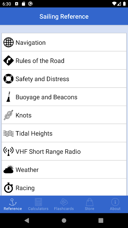 सेलिंग संदर्भ अपने समुद्री नेविगेशन की जरूरत के सभी के लिए व्यापक संदर्भ गाइड है। शुरुआत और अनुभवी नाविकों के लिए आदर्श है, एप्लिकेशन जानकारी गुजर विभिन्न RYA Yachtmaster shorebased नेविगेशन और व्यावहारिक पाठ्यक्रमों के लिए महत्वपूर्ण होता है। सभी सामग्री को पूरी तरह से ऑफ़लाइन उपलब्ध इसलिए सब पर एक डेटा कनेक्शन पर निर्भर नहीं है। वहाँ जल्दी, बधिया करने के लिए एक पाठ्यक्रम का आकलन ज्वार की धारा डेटा interpolating, माध्यमिक बंदरगाहों पर समय और ज्वार की ऊंचाइयों की गणना, और वीएचएफ रेडियो प्रसारण पर्वतमाला के आकलन के लिए काम calculators हैं। में गहराई संदर्भ अनुभाग को कवर गाइड कैसे करने के लिए सचित्र और विस्तृत के दर्जनों शामिल हैं: