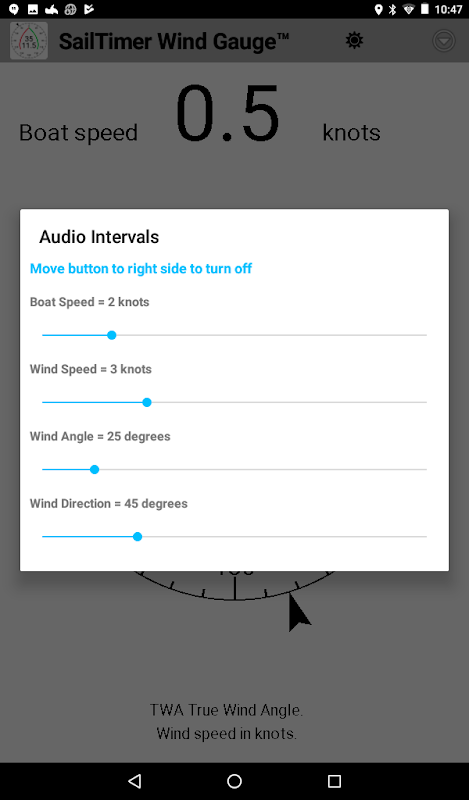 यह ऐप एक विज़ुअल विंड गेज प्रदान करता है जो वायरलेस, सौर-संचालित सेलटाइमर विंड इंस्ट्रूमेंट ™ के लिए एक डिस्प्ले है। यदि आप अपने फोन/टैबलेट को सुरक्षित रखने के लिए दूर रखना चाहते हैं, तो ब्लूटूथ स्पीकर का उपयोग करें और नौकायन के लिए अपने हाथों और आंखों को मुक्त रखें: विवरण और 45-सेकंड का YouTube डेमो http:/ पर देखें। /eepurl.com/dEGN7b