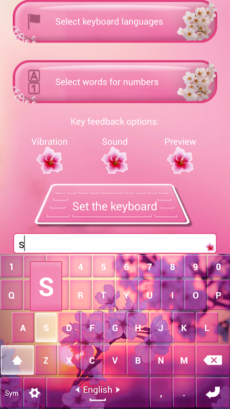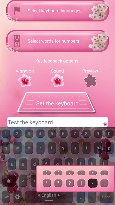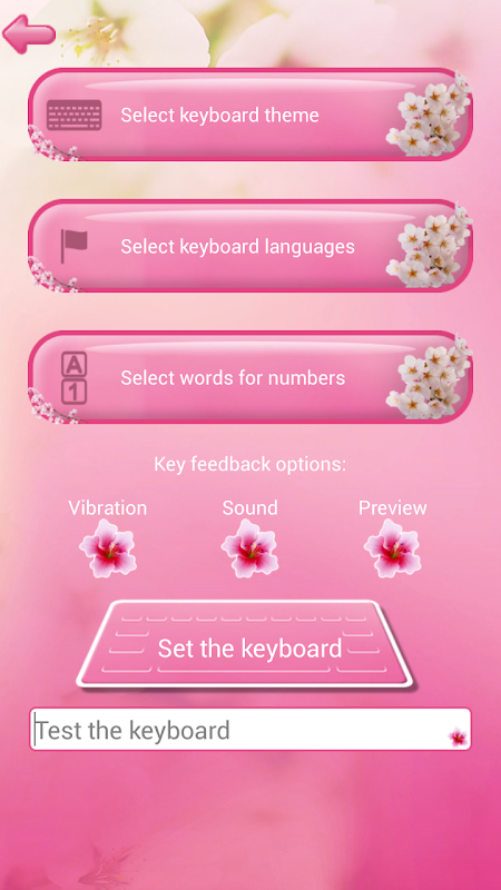 आवेदन करने के लिए लौटें, फिर 'कीबोर्ड सेट डिफ़ॉल्ट करने के लिए' बटन और चेरी फूल कीबोर्ड थीम का चयन