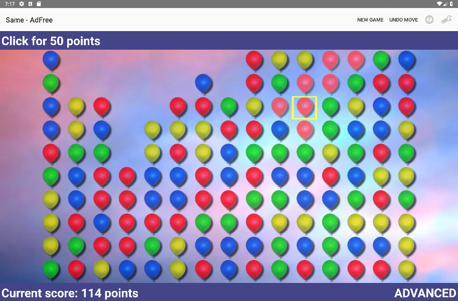 बीच में दो मिनट के लिए खेलने के लिए अत्यधिक व्यसनी खेल। एक ही रंग के गुब्बारे खोजें और उन्हें फोड़ें। आसानी से सीखा जा सकता है और बहुत मज़ा आता है।