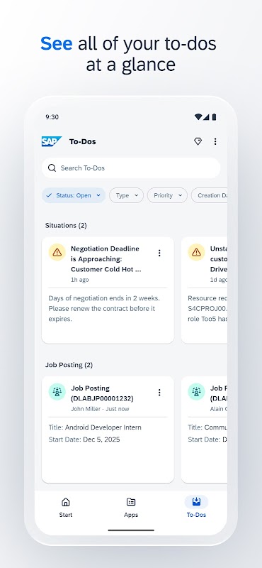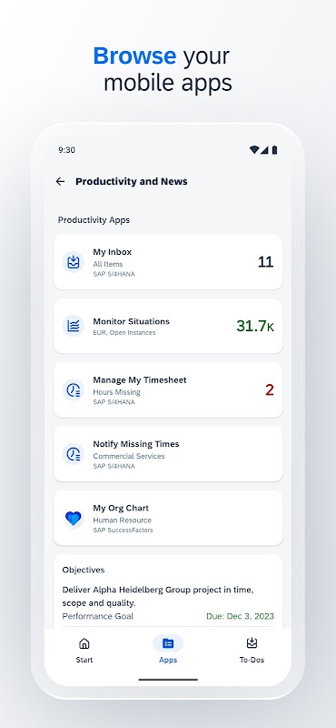SAP मोबाइल स्टार्ट के साथ कहीं भी और कभी भी बुद्धिमान उद्यम तक पहुँचें।