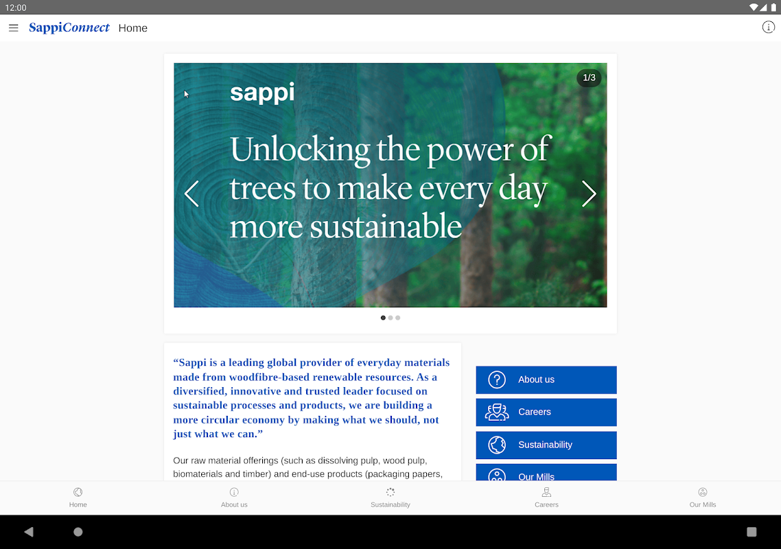 SappiConnect हमारे भागीदारों, ग्राहकों, कर्मचारियों और आपूर्तिकर्ताओं को लोगों, समुदायों और ग्रह को लाभ पहुंचाने के लिए नवीकरणीय संसाधनों की शक्ति को अनलॉक करके एक संपन्न दुनिया बनाने के Sappi के उद्देश्य के बारे में अधिक जानने के लिए एक मंच प्रदान करता है।