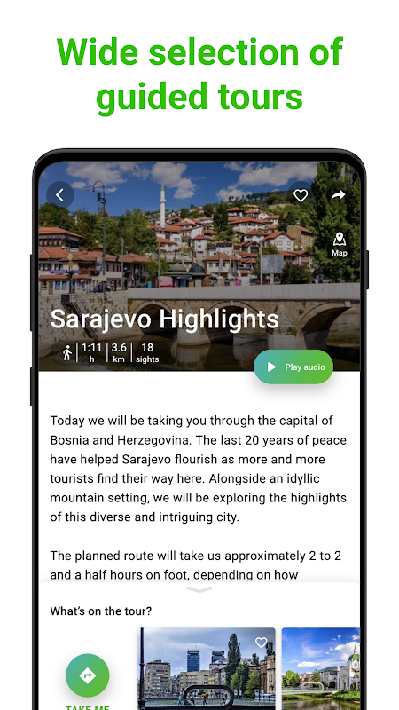 स्मार्टगाइड आपको भटकने नहीं देगा और आप कोई भी दर्शनीय स्थल देखने से नहीं चूकेंगे। स्मार्टगाइड आपकी सुविधा के अनुसार साराजेवो के आसपास आपका मार्गदर्शन करने के लिए जीपीएस नेविगेशन का उपयोग करता है। आधुनिक यात्री के लिए दर्शनीय स्थल।