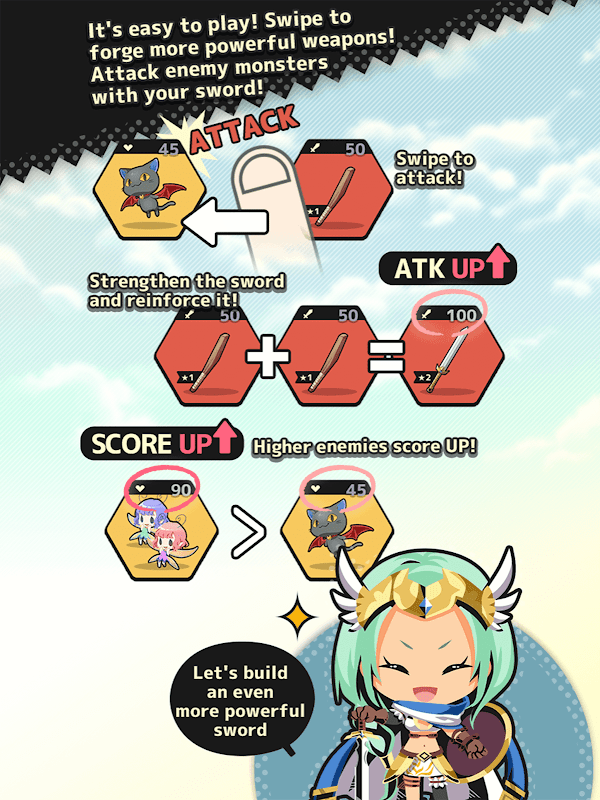 एक साथ तलवारों को ढेर करने के लिए स्वाइप करें और एक और अधिक शक्तिशाली तलवार का निर्माण करें!