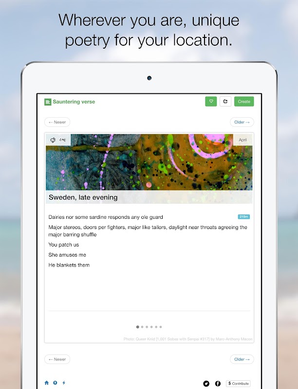 Sauntering verse generates Dadaist poetry based on your physical location. Take your device for a walk and see poetry created in front of your eyes.