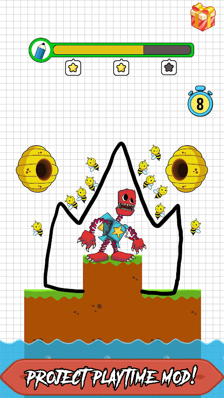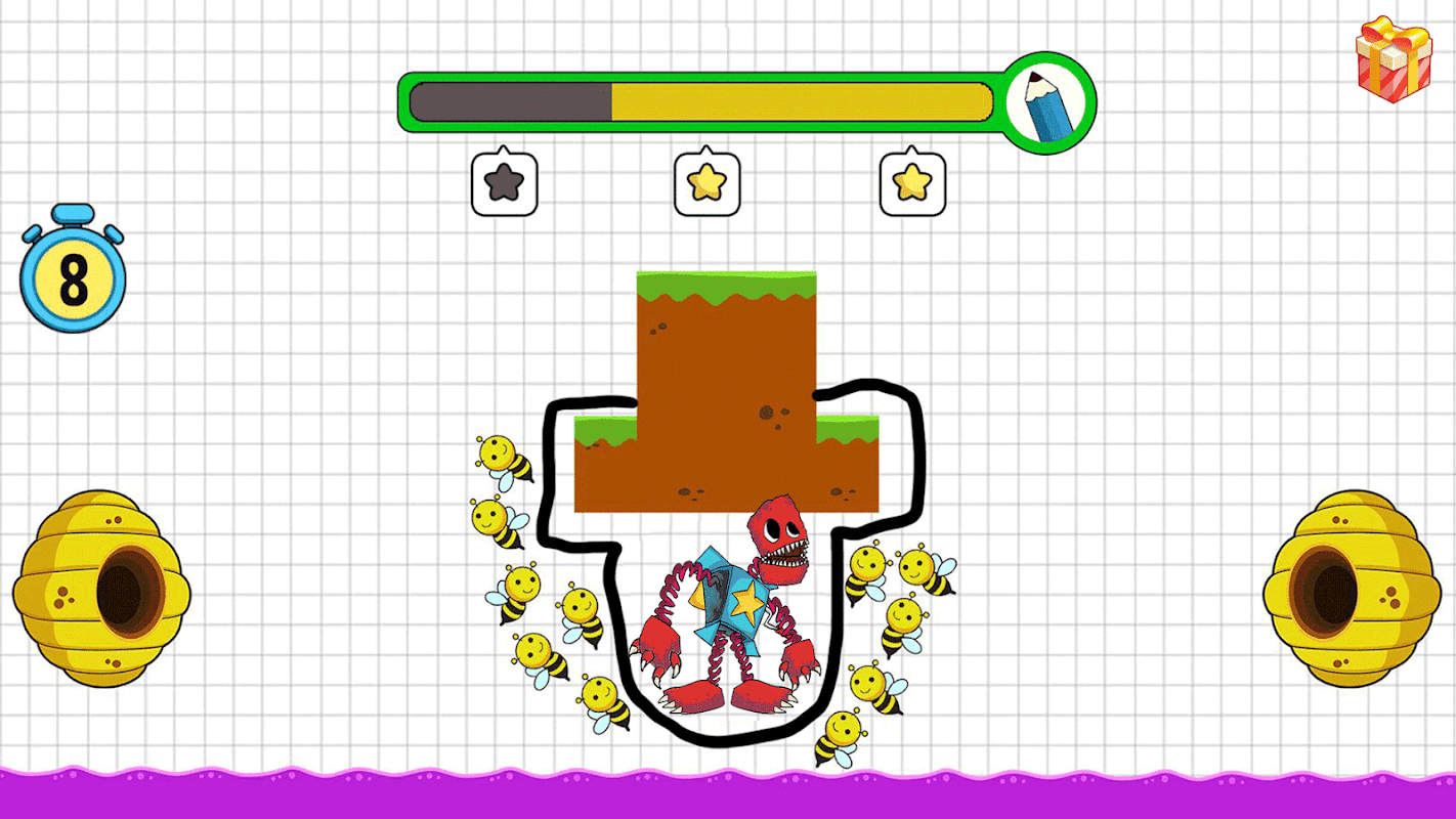 एक रेखा खींचने के लिए टैप करें और बॉक्सी बू को मधुमक्खियों के हमले से बचाएं: अपनी रेखा खींचने के लिए दबाएं। सुनिश्चित करें कि आपकी रेखा उस नीले राक्षस को चोट नहीं पहुंचाएगी जिसकी आपको रक्षा करने की आवश्यकता है।