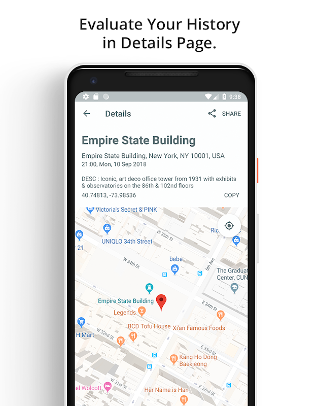 View you history, complete with Map, Share to your friends, Copy-paste the coordinate, or get a direction from your current location.