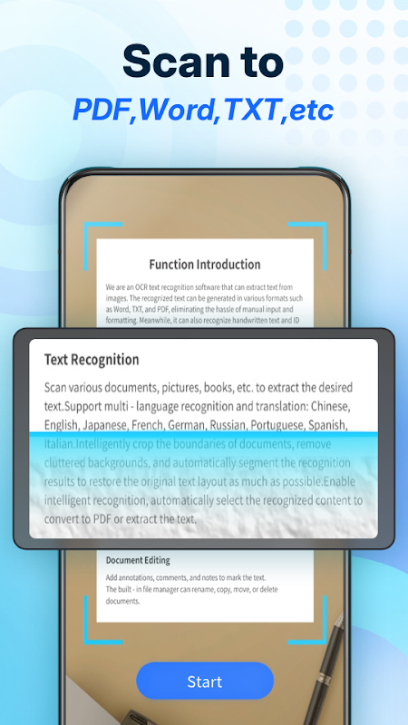 क्या आपको एक शक्तिशाली दस्तावेज़ स्कैनर की आवश्यकता है? अपने मोबाइल डिवाइस को पोर्टेबल स्कैनर में बदलें! OCR तकनीक से फ़ाइलें, पहचान पत्र या किताबें स्कैन करें, संपादन योग्य टेक्स्ट निकालें और तुरंत सुरक्षित PDF फ़ाइलें बनाएं।