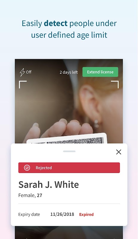 एप्लिकेशन तथाकथित बाउंसर मोड प्रदान करता है - उम्र सीमा निर्धारित करने और तदनुसार लोगों को फ़िल्टर करने की क्षमता। यदि व्यक्ति आयु सीमा से अधिक है, तो स्कैन किए गए डेटा को हरे रंग की पृष्ठभूमि पर दिखाया गया है। यदि नहीं, तो पृष्ठभूमि लाल है। यह एक्सपायर्ड लाइसेंस का भी पता लगा सकता है।