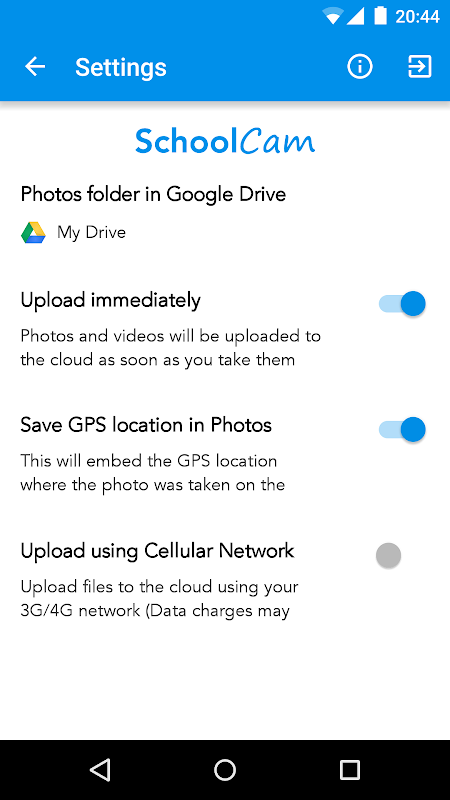 SchoolCam साथ ले कि तस्वीरें और वीडियो स्वतः डिवाइस पर संग्रहित किया जा रहा बिना गूगल ड्राइव पर जमा हो जाती है। इस कक्षा के लिए फोटो के पूर्ण नियंत्रण का मतलब है!