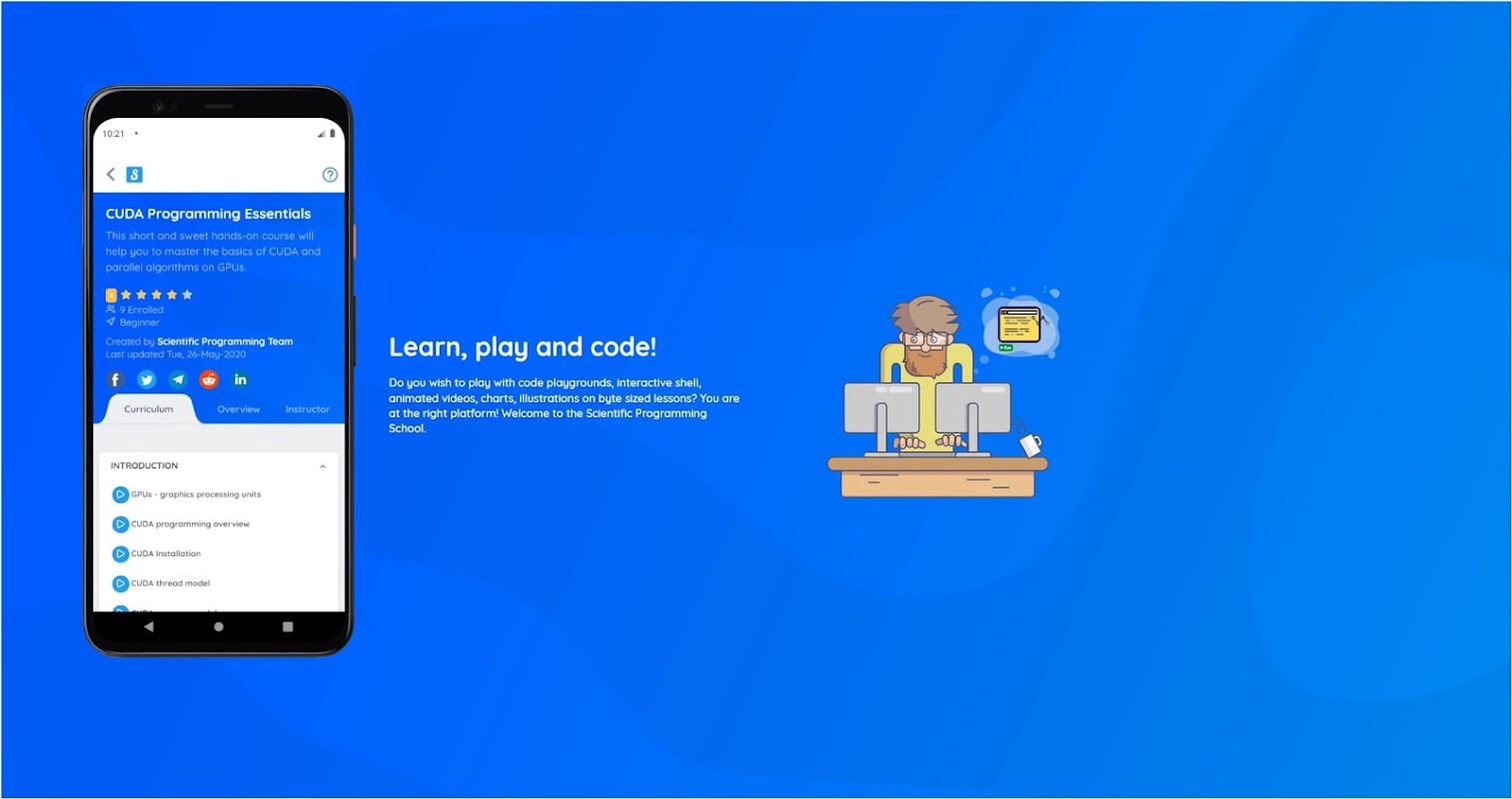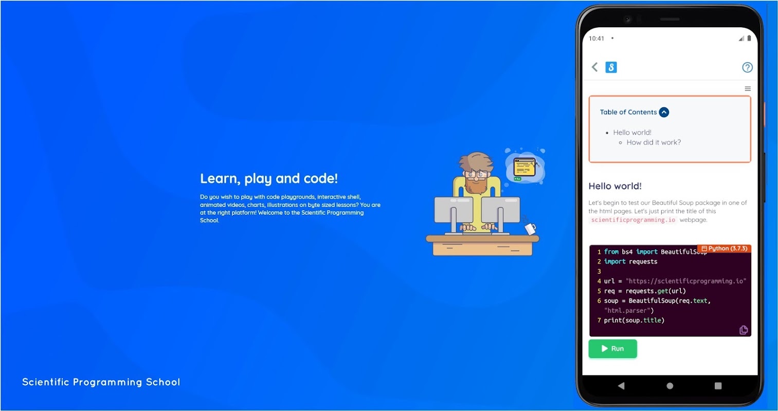 वैज्ञानिक प्रोग्रामिंग स्कूल प्रशिक्षकों, छात्रों और पेशेवरों के लिए एक इंटरैक्टिव प्रोग्रामिंग लर्निंग ऐप है, जो लिनक्स, डेवोप्स, एचपीसी और डेटा साइंसेज में रुचि रखते हैं। यह सभी तीन लिनक्स ओएस फ्लेवर (उबंटू, आरएचईएल और एसयूएसई), विंडोज पावर शेल और 50+ प्रोग्रामिंग भाषाओं का समर्थन करता है, जिसमें सी # जैसे वाणिज्यिक वाले भी शामिल हैं।