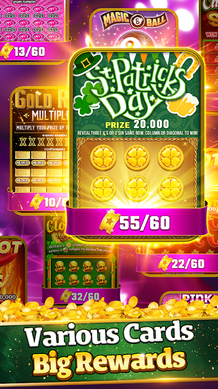 स्क्रैच कार्ड: गेम का मुख्य उद्देश्य छिपे हुए पुरस्कारों को प्रकट करने के लिए कार्ड को स्क्रैच करना है। 🤑 प्रत्येक कार्ड अपनी थीम के साथ आता है, जिससे हर खेल एक नया रोमांच बन जाता है। 🍀💰
