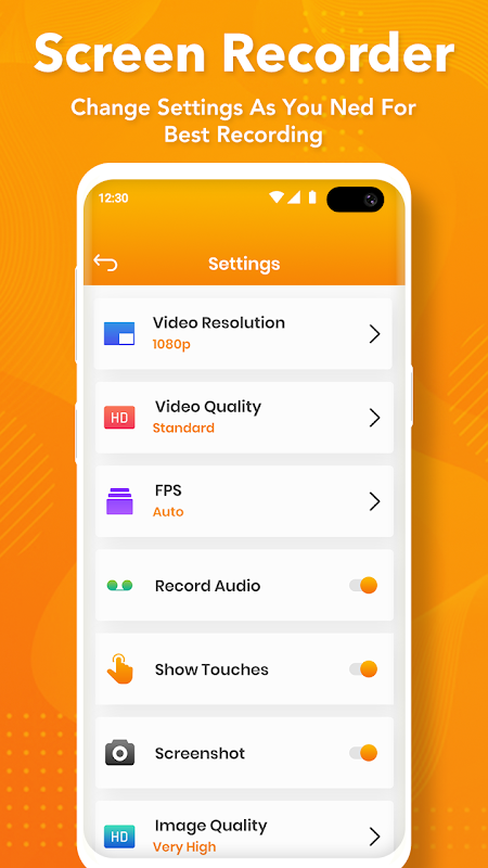 Screen Video Recorder - Screen recorder with audio supports recording game screen in the highest quality, 1080p, 12Mbps, 60FPS. Of course, you can record screen with adjustable resolution (240p to 1080p), quality, and FPS(15FPS to 60FPS).