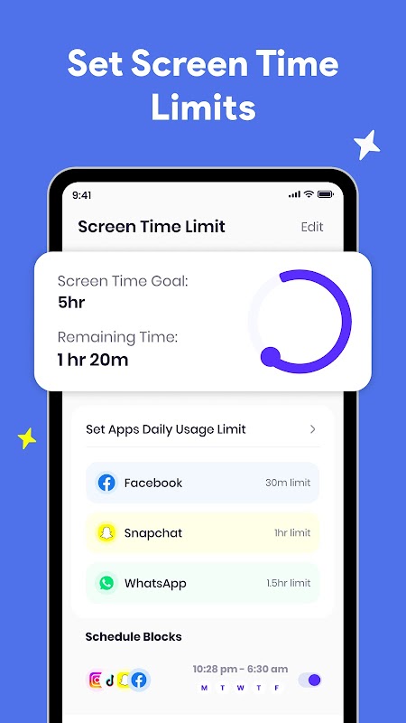 उन ऐप्स के लिए दैनिक सीमाएँ निर्धारित करें जो आपका सबसे ज़्यादा ध्यान भटकाते हैं। सीमा पूरी होने पर, ऐप अपने आप ब्लॉक हो जाता है, जिससे आपको अनुशासित रहने में मदद मिलती है। कुछ ऐप्स को केवल विशिष्ट समय पर ही अनुमति देने के लिए शेड्यूल बनाएँ—दिन में पढ़ाई के लिए ऐप्स, बाद में मनोरंजन के लिए।