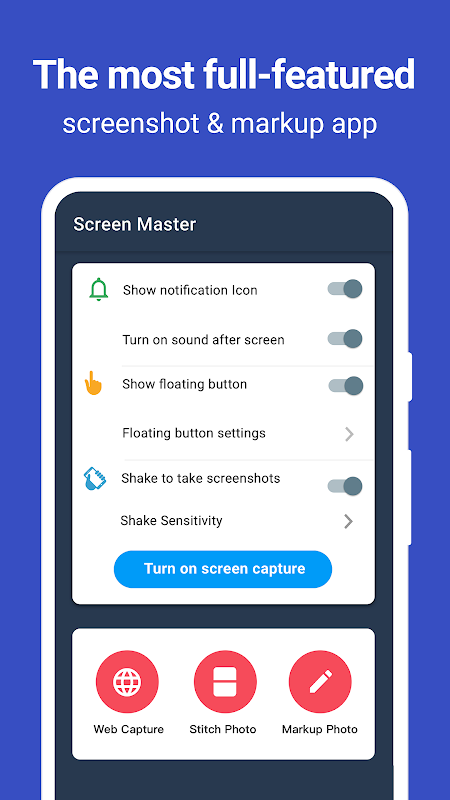 स्क्रीन मास्टर एक नि:शुल्क, उपयोग में आसान, बिना रूटिंग के स्क्रीनशॉट और फोटो मार्कअप टूल है। स्क्रीन मास्टर के साथ, आप फ्लोटिंग बटन या डिवाइस को हिलाकर स्क्रीन कैप्चर कर सकते हैं, जिससे आप अपने टैबलेट, फोन या अन्य एंड्रॉइड डिवाइस पर स्क्रीनशॉट ले सकते हैं!
