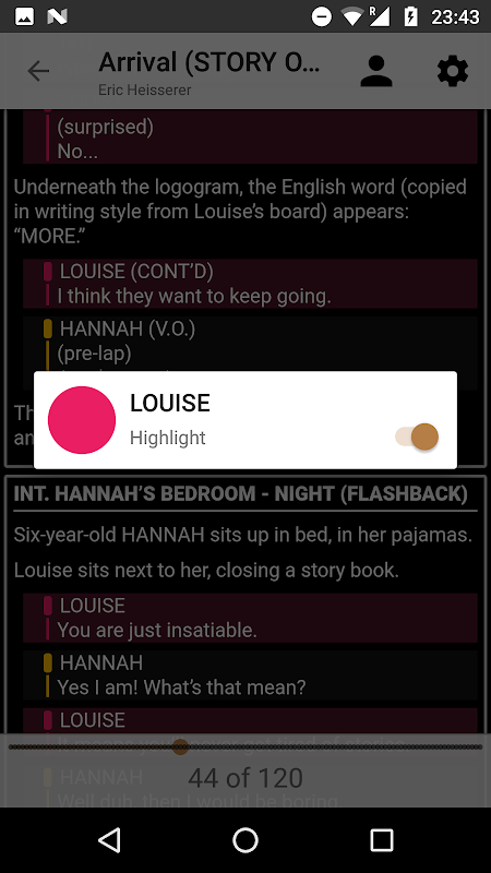 - दृश्य नेविगेशन: स्क्रिप्ट के सभी दृश्यों की सूची देखने के लिए स्क्रीन के बाएं किनारे से स्वाइप करें। उस दृश्य पर सीधे नेविगेट करने के लिए एक टैप करें।