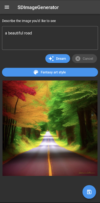 SDImageGenerator एक टेक्स्ट टू इमेज जनरेशन आर्टिफिशियल इंटेलिजेंस ऐप है। बस अपनी छवि का वर्णन करें उदाहरण के लिए "एक काल्पनिक परिदृश्य" और सपना बटन टैप करें।