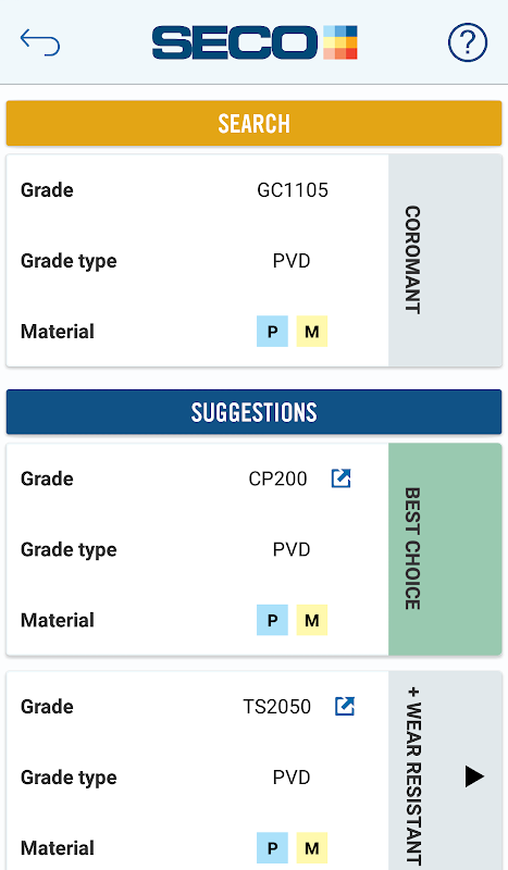 Grade refers to the cutting tool material and is normally the last part of the insert designation (e.g. “TP2501”). The grades covered by Seco Compare include general ISO turning, parting-off and grooving as well as ISO advanced materials such as CBN, PCD, ceramics and cermet.