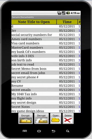 You have to juggle a lot of sensitive information: log-in IDs and passwords, credit cards and bank account numbers, family Social Security numbers, sensitive e-mails and texts, etc. Sometimes it seems like it's getting to be too much to handle. Secure Documents offers a way of ensuring that all of these documents and numbers are both readily accessible to you and emphatically private. Using Triple DES or Single DES Encryption, the app saves your information to a protected database inside your Android device. Secure Documents encrypts and stores virtually anything: sensitive emails, passwords, account numbers, etc. Your data remains readily available for you to decrypt and reference, but safe from prying eyes in the event that your phone is lost, stolen, or snooped through. This Lite Version will allow two files only to be saved. Please buy the Full Version for Full Access. Thank you