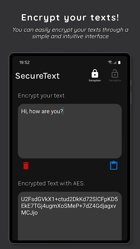 सिक्योरटेक्स्ट संदेशों, पासवर्ड, नोट्स और संवेदनशील डेटा को एन्क्रिप्ट करने के लिए बनाया गया एक ऐप है, जो आपकी व्यक्तिगत जानकारी के लिए उच्चतम स्तर की सुरक्षा सुनिश्चित करता है। हमारे ऐप के साथ, आप एन्क्रिप्शन एल्गोरिदम का उपयोग करके अपने टेक्स्ट को आसानी से एन्क्रिप्ट कर सकते हैं, यह सुनिश्चित करते हुए कि केवल आप और विश्वसनीय व्यक्ति ही संरक्षित जानकारी तक पहुंच सकते हैं।