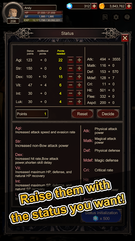 आप अपने हीरो की 5 स्थितियाँ (Agi, Str, Dex, Vit, Int, और Luk) स्वतंत्र रूप से सेट कर सकते हैं, ताकि आप अपनी पसंद का हीरो बना सकें।