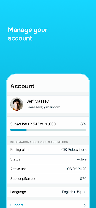 अपने SendPulse चैटबॉट सदस्यता योजना और अपने बॉट ग्राहकों की संख्या के बारे में जानकारी देखें। एप्लिकेशन भाषा बदलें और एक क्लिक के साथ SendPulse समर्थन से संपर्क करें।