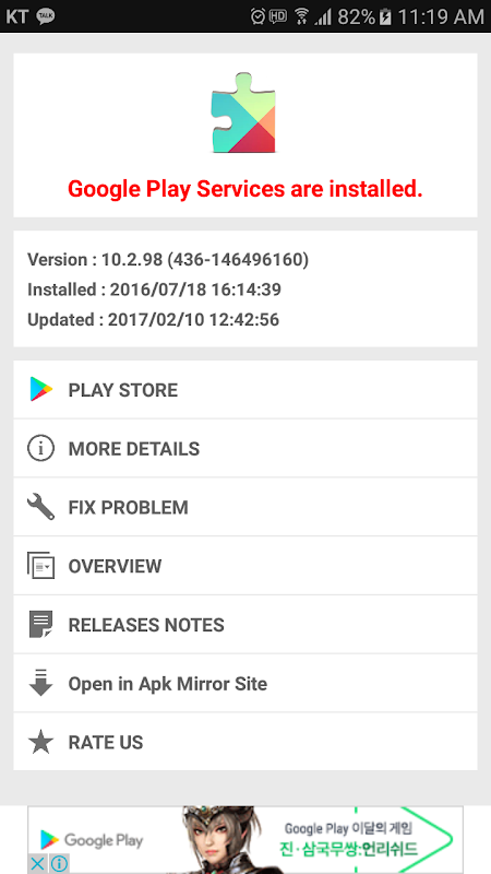 Also, This app helps you to know the version of your google play services, you can see the date of installation of the Play Services and also the date of the last update.