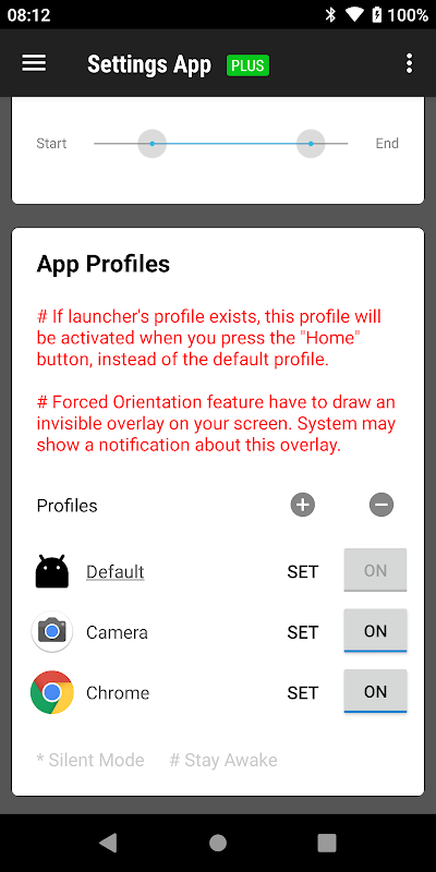 You can configure your apps behavior by adjusting the profile in this app. For example, when you are reading news and watching video, you might want to adjust to a specify orientation and keep the screen awake.