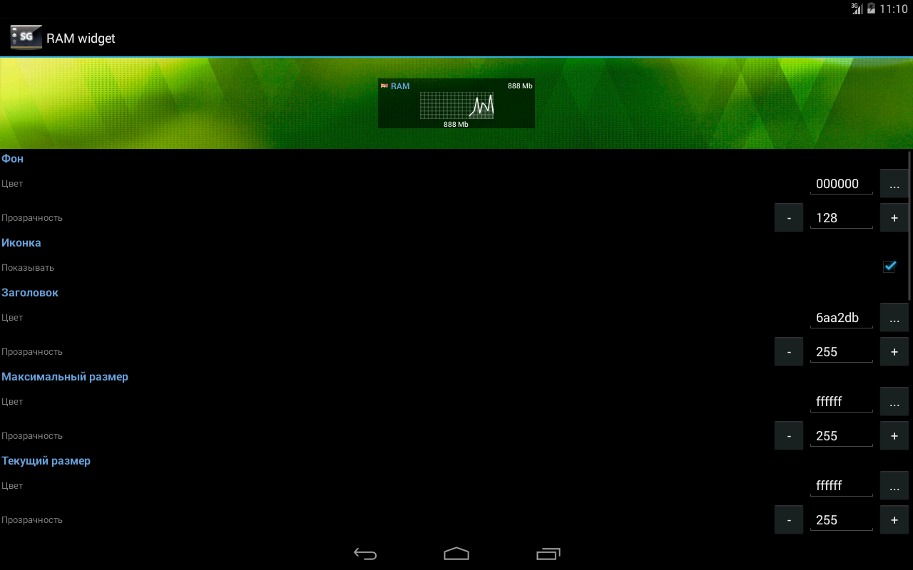- RAM widget (отображает текущую загрузку оперативной памяти в виде графика);