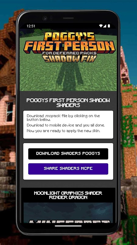 शेडर माइनक्राफ्ट और टेक्सचर पैक: यह विकल्प केवल आपके माइनक्राफ्ट दुनिया में शेडर लागू करेगा, मूल बनावट को बरकरार रखेगा। आप अपनी प्राथमिकताओं और डिवाइस के प्रदर्शन के अनुरूप शेडर्स को कस्टमाइज़ कर सकते हैं।