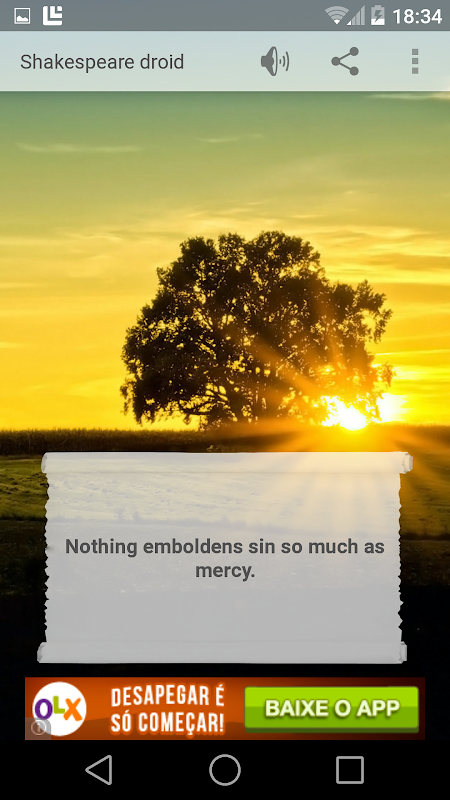 O Shakespeare Droid trás para você diversas frases do grande William Shakespeare, permitindo que você tenha uma leitura de qualidade, ouvindo uma tranquila música e com uma imagem de fundo animadora.