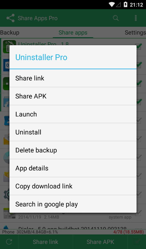 4. Long press and pop more features(Share link,Share APK,Uninstall, Backup, Google Play, Details)