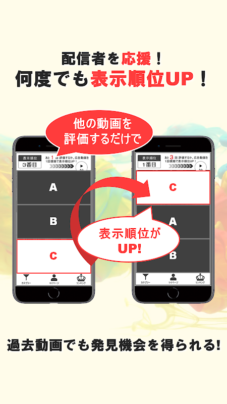 本アプリにシェアした動画は、自力で「表示順位をアップ」することができるので、「視聴回数の増加が期待できる」 =「 配信者の応援」になります!また、過去の動画の掘り起こしにも使えます!