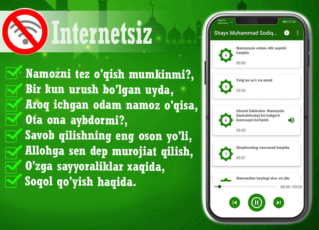 Shayx Mohammad Sodiq maruzalarini internetsiz eshiting.