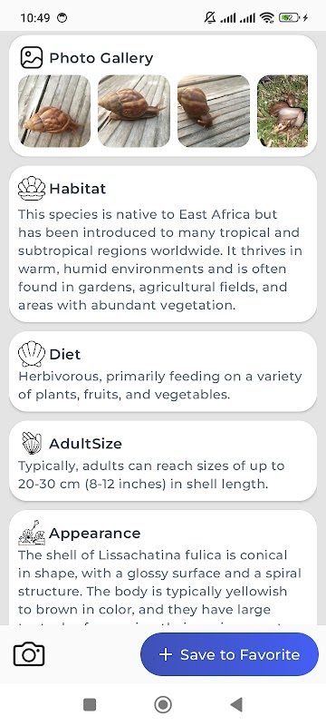 आपने बहुत सारे घोंघे देखे हैं लेकिन क्या आपको पता है कि उन्हें क्या कहा जाता है या वे किस प्रजाति के हैं? हमारा ऐप आपके घोंघे का नाम और प्रजाति केवल आपकी फोटो लेकर बताएगा। आप जीवित घोंघों की तस्वीर ले सकते हैं या उनके खोल की तस्वीर ले सकते हैं। इसके अलावा, हम अन्य मोलस्क जैसे कीट, सीप, क्लैम, और स्क्विड को भी वर्गीकृत कर सकते हैं।