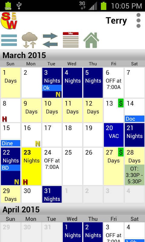 * रंग, पाठ, या प्रतीक के रूप में कैलेंडर पर अपनी पारियों को प्रदर्शित करें।
