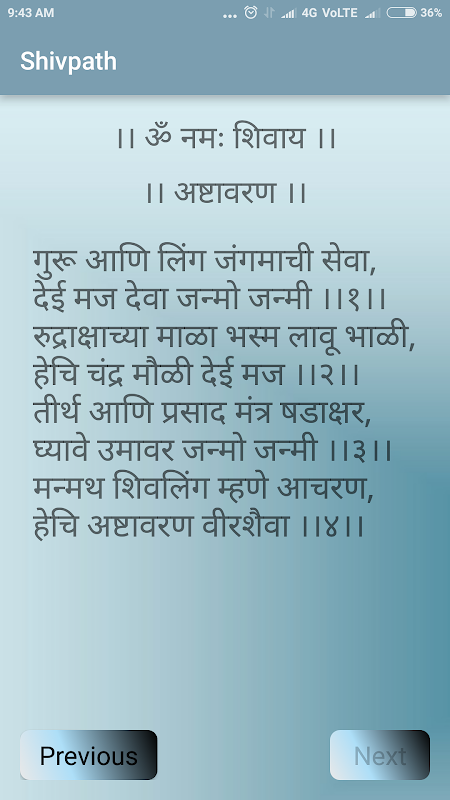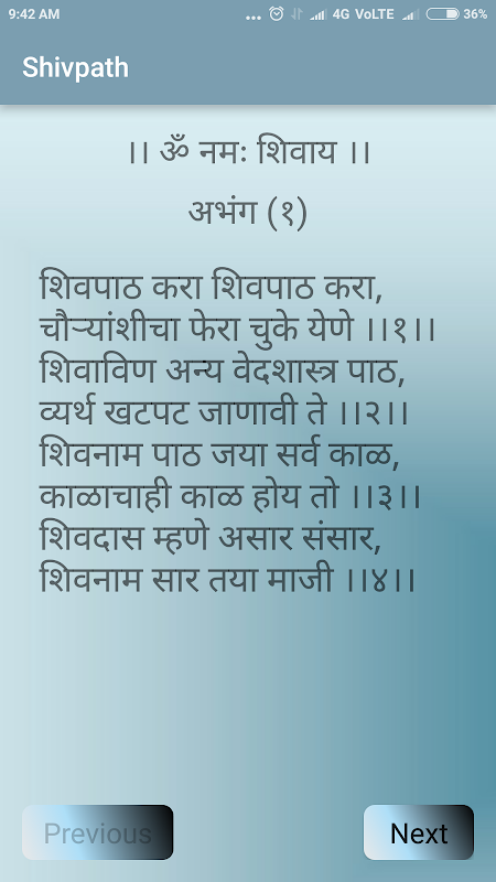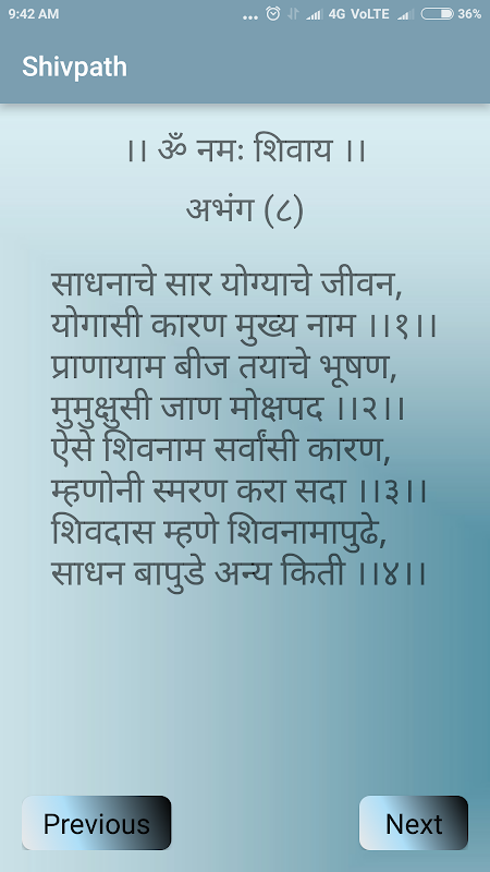 The application comprises of a set of 29 abhangas composed by 'Shivdas' Swami, under the name 'Shivpath' describing the importance of chanting the name of Lord Shiva.