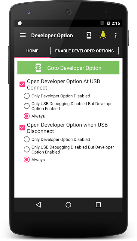 ★ Our App helps the developer when they Plugin & Plug out mobile via USB, it automatically pop up the developer options. So no need to go in to the developer option via settings every time for enabling the USB debugging.