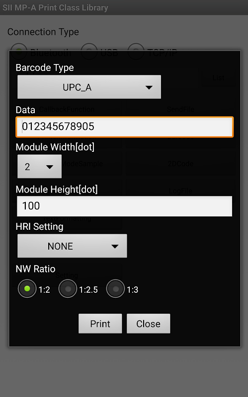 इस एप्लिकेशन को आप Seiko उपकरण इंक (SII) मोबाइल प्रिंटर MP-एक सांसद-ए प्रिंट कक्षा SII द्वारा प्रदान की लाइब्रेरी का उपयोग श्रृंखला के लिए पाठ या बारकोड मुद्रित करने के लिए अनुमति देता है।