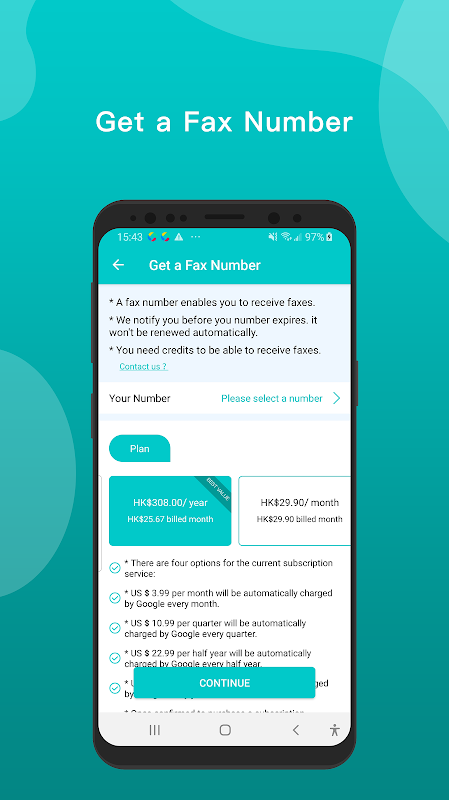 आप अपने Android फोन पर फैक्स प्राप्त करने के लिए ऐप में दिए गए सदस्यता मॉडल को खरीदकर यूएसए या कनाडा से एक अस्थायी और समर्पित फैक्स नंबर प्राप्त कर सकते हैं। और जब आप एक नया फैक्स प्राप्त करेंगे तो आपको एक धक्का सूचना के साथ देखा जाएगा।