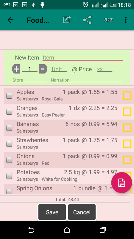 एक सूची का उपयोग इनपुट मोड में किया जा सकता है जो आपको मात्रा, मूल्य, स्टोर आदि के विवरण के साथ आइटम जोड़ने की अनुमति देता है।