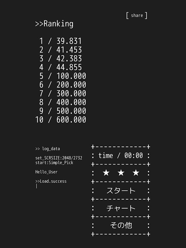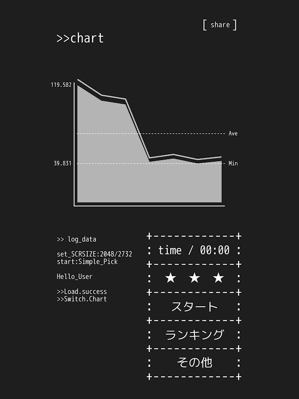 「Simple Pick」はコマンドプロンプトタイプの非常にシンプルなテストアプリです。あなたのタイムを「Share」からSNSにアップロードしましょう。