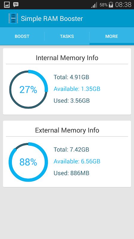 Simple RAM Booster is The best application to speed your device CPU up to 80%, optimize android system, clean temporary memory, clean RAM and cache, clean SD card, remove junk file, speed game and browser up, close application running under background, increase starting speed and boost internet connection speed, boost loading file and SD card. With Simple RAM Booster, you can optimize your android devices by several simple steps.
