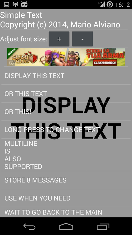 यह 8 व्यक्तिगत संदेश है कि स्टोर में एक बहुत ही सरल एप्लिकेशन को आपके टेबलेट या फ़ोन पर पूर्ण स्क्रीन दिखाया जा रहा है. बहुत आसान! कोई विन्यास बिल्कुल भी नहीं है. बस अपने संदेशों सेट और अपनी आवश्यकताओं फिट करने के लिए फ़ॉन्ट आकार को समायोजित!